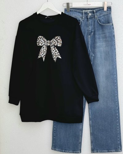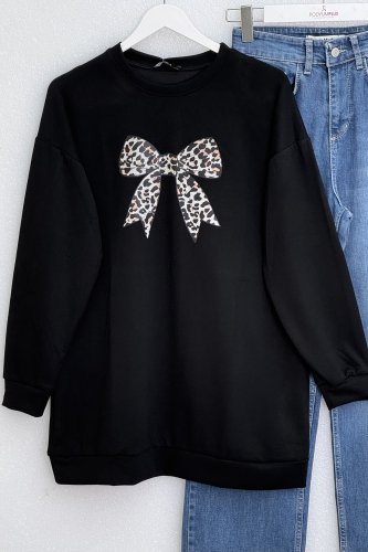 • Yuvarlak Yaka Fiyonk Baskılı Salaş Oyşo Tunik Siyah