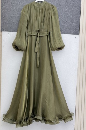 Eteği Volanlı Kemerli Janjan Şifon Elbise Haki