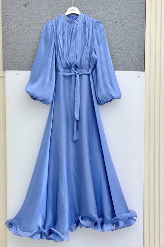 Eteği Volanlı Kemerli Janjan Şifon Elbise Mavi